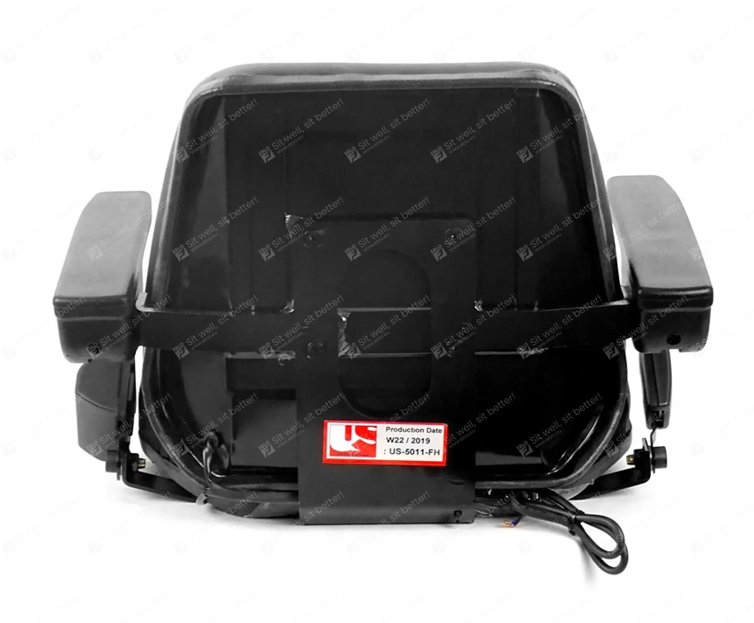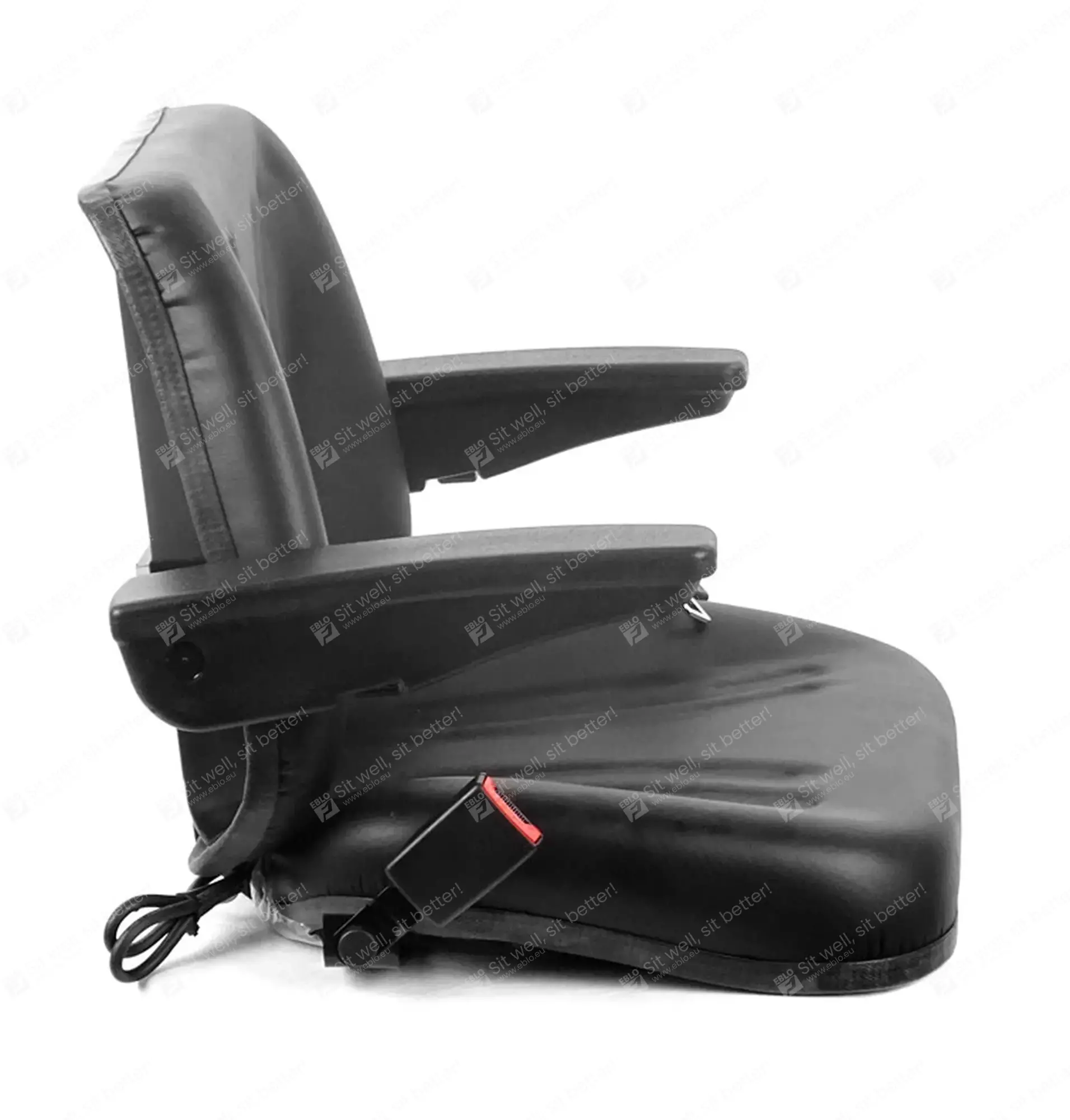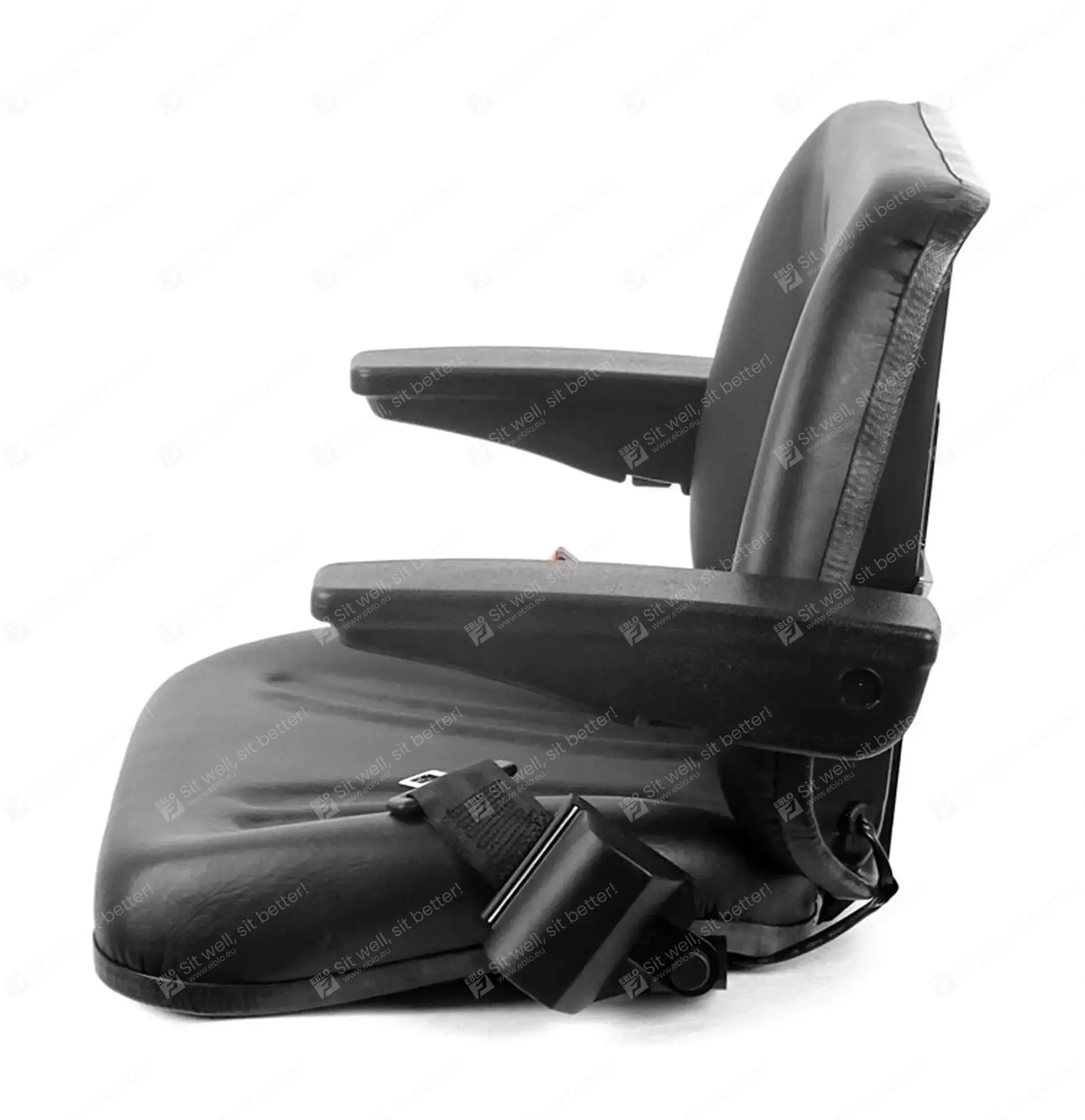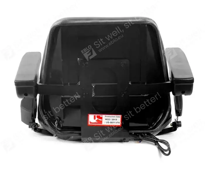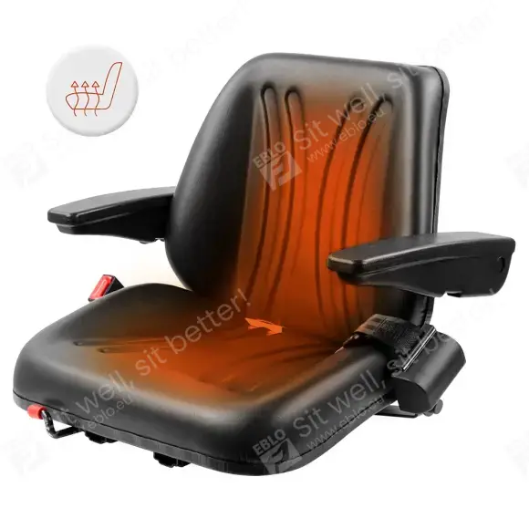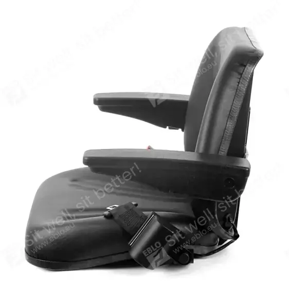 Le revêtement en PVC robuste du siège UnitedSeats 5013 résiste aux intempéries et à l'eau et est équipé de canaux de drainage pratiques. Ce siège convient donc aux machines à cabine ouverte. Il est équipé de série d'accoudoirs réglables et d'un harnais à deux points.